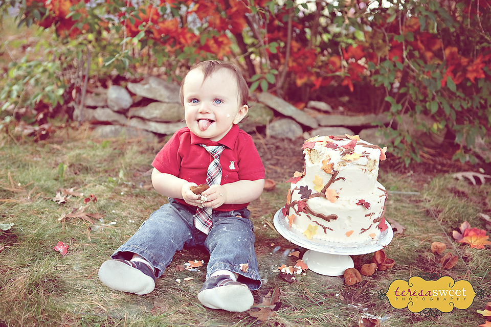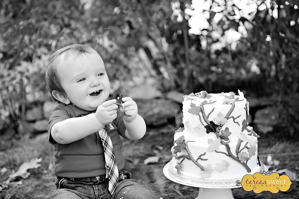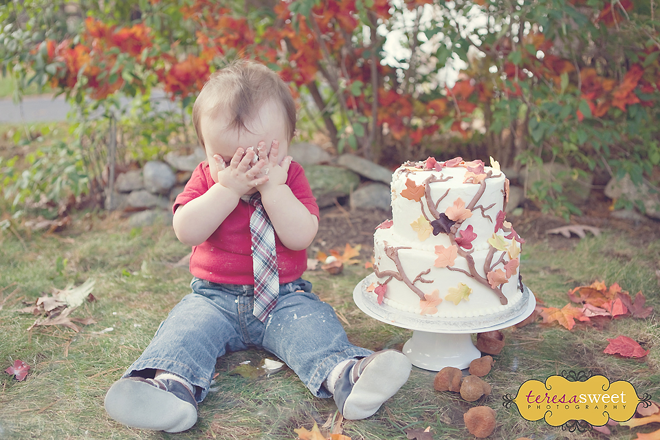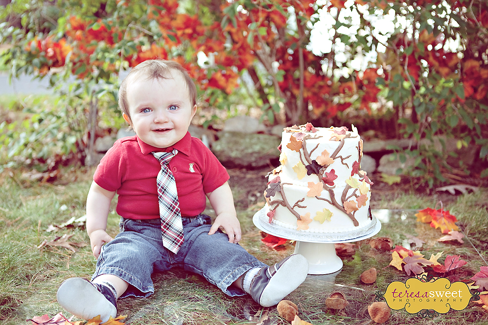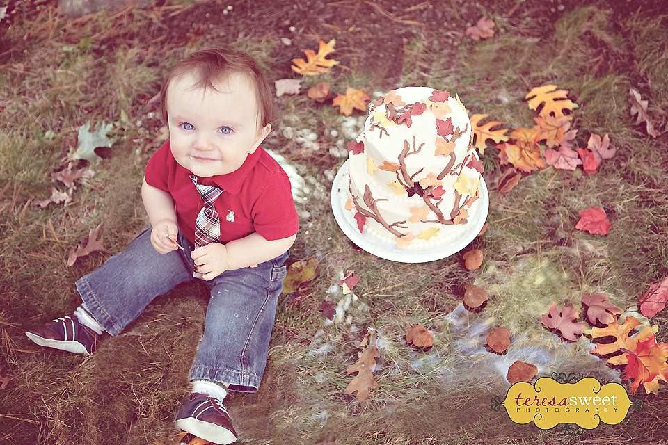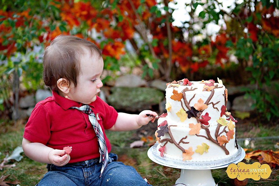I’ve been collaborating with Kristin, owner of The Cupcakerie (http://www.thecupcakerie.net). She does such AMAZING work and her cupcakes and cakes are to die for! So it wasn’t a question whom I would ask to do a cake for my son’s first birthday cake smash. 😉 As an artist, I can understand how fun it is to have full control of a vision so all I told Kristin was that I wanted fall colors (preferably leaves) on the cake. But other than that, she could do whatever she wanted. I was blown away by this cake she presented to me. It was big, beautiful and one that I couldn’t wait to photograph!