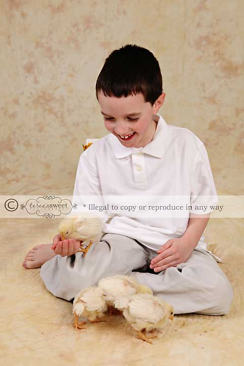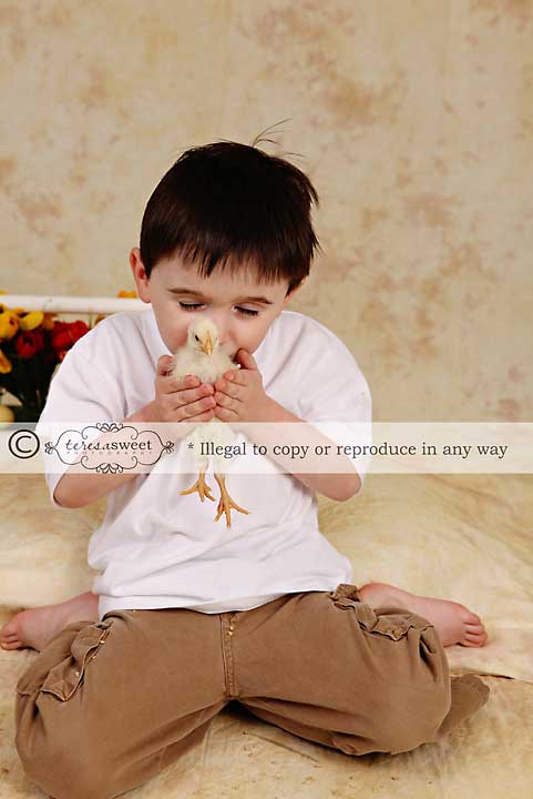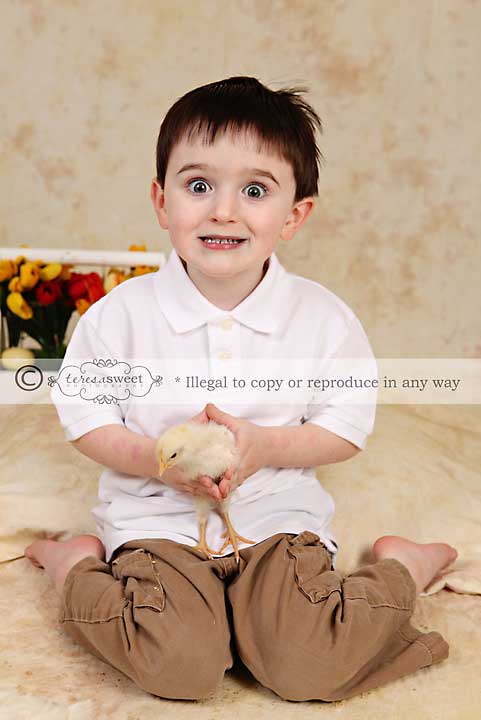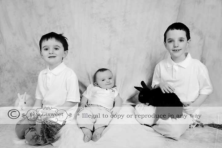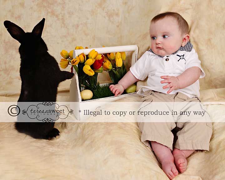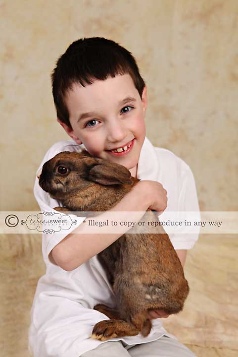 Ty wanted nothing to do with the camera, hubby is behind the backdrop trying to hold him still, Tyler’s grabbing the flowers and trying to eat them, I’m chasing the bunnies, trying to fix Ty from slipping, etc etc etc…lol