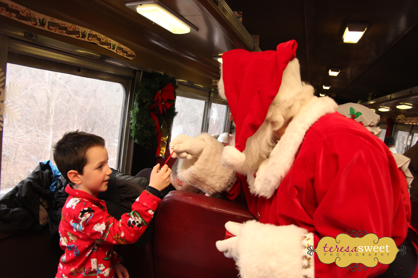 When the train stopped at the end of the tracks to start heading back, it was announced that we were at the North Pole. My boys eyes were as round as saucers!! There was a river that had iced over with a little snow so all the children believed it. I love this age, their innocence and the magic of Christmas. Then we all sang Christmas carols and all of a sudden….Santa Claus & Mrs. Claus appeared!! The kids were ecstatic!! He went to each child and gave them a bell from his sleigh….even Tyler got one 😉 Then the kids received a coloring book & crayons and it was off to head back to the train station.