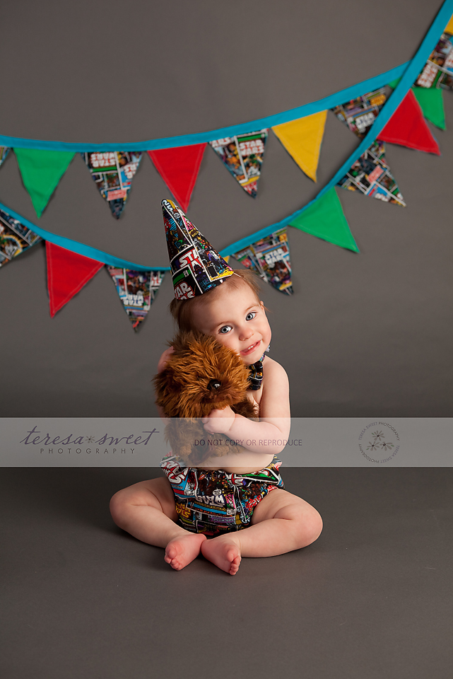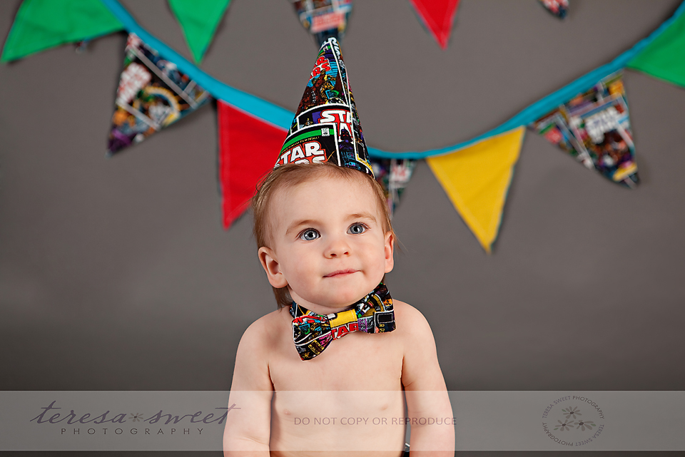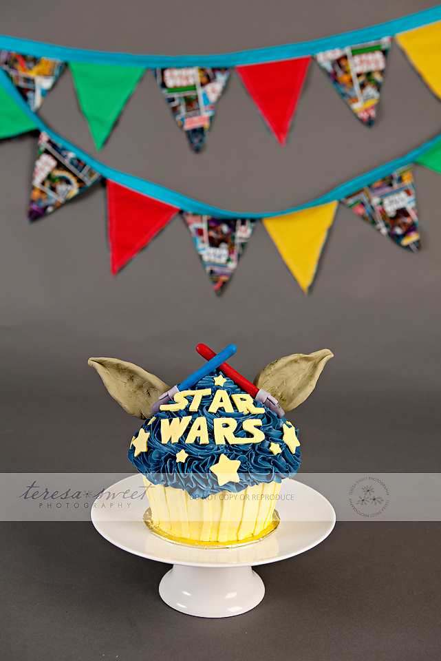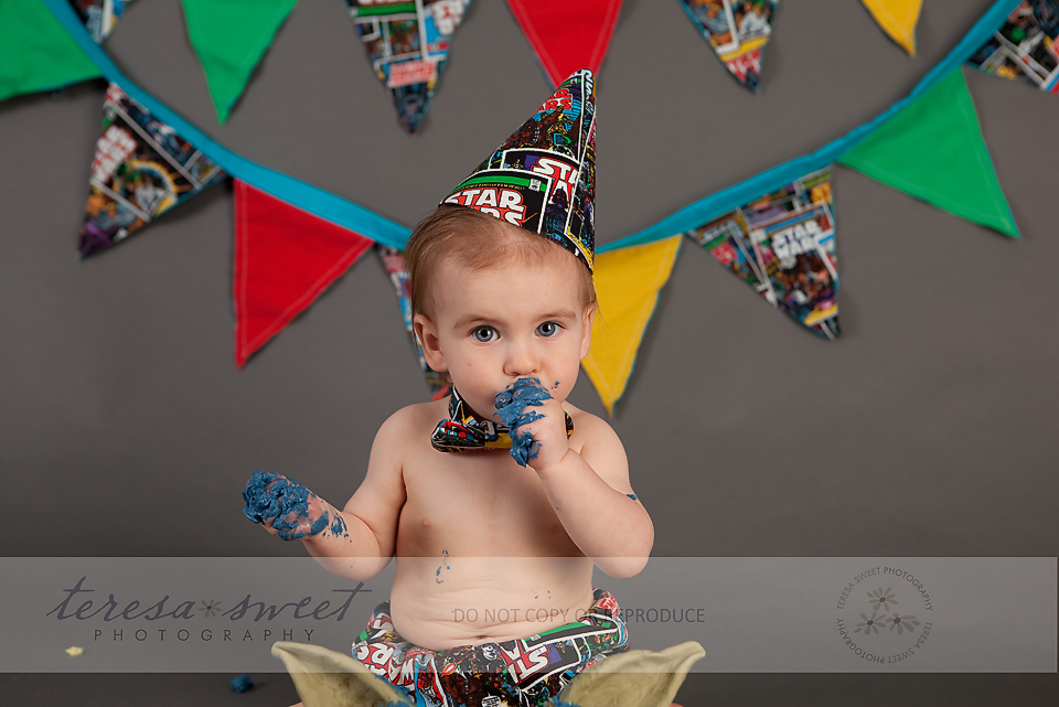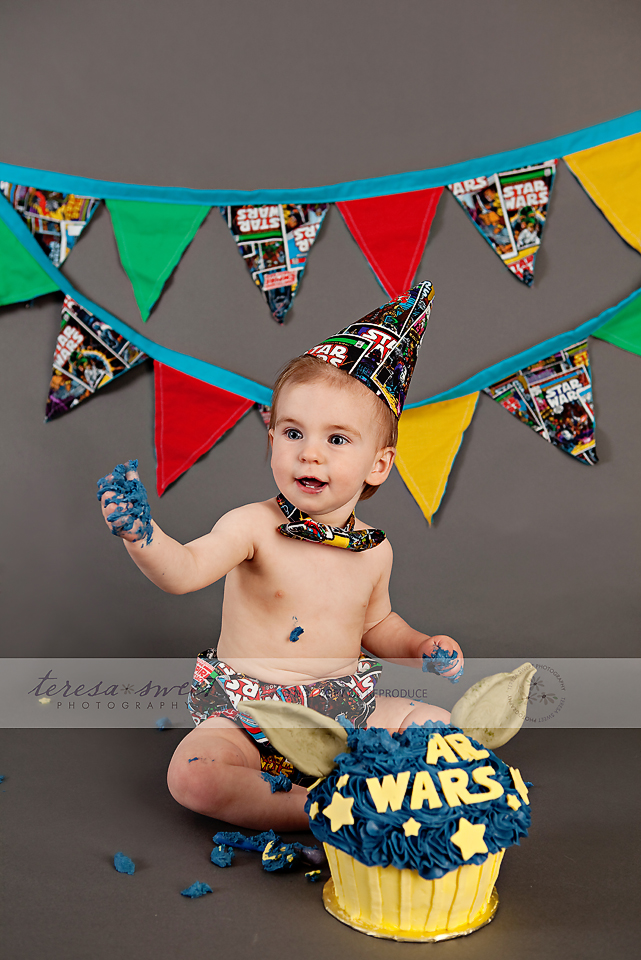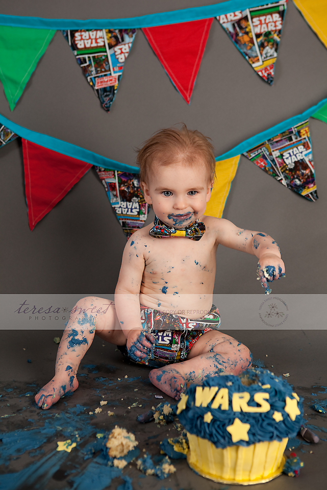 I simply adore this family. I’ve been photographing the *W* family for quite a few years now and their youngest just turned ONE! So what better way to celebrate it than with a super fun cake smash?! I was really excited when the W family mentioned they wanted a Star Wars themed session and after that, I let Kristin from The Cupcakerie run away with it! How AWESOME is this CAKE?! I just cannot get over it!! Mr. G took about 2 seconds to start digging into it and it wasn’t long before it was completely destroyed! So much fun!