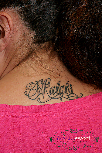 Brittany D. (from Fall River, MA) said: She’s known Arias for eight years. She came to Sin on Skin with a little bit of an idea as to what she wanted but she also wanted the artists to create it and let them decide what looked best. Brittany wanted tattoos that represented her: a butterfly with stars on her ankle and one of her son’s name, Malaki (almost 2 yrs old) that is located on her neck. The reason why she chose Sin on Skin for her tattoos is because “she was more comfortable with the artists and she really liked the results!”